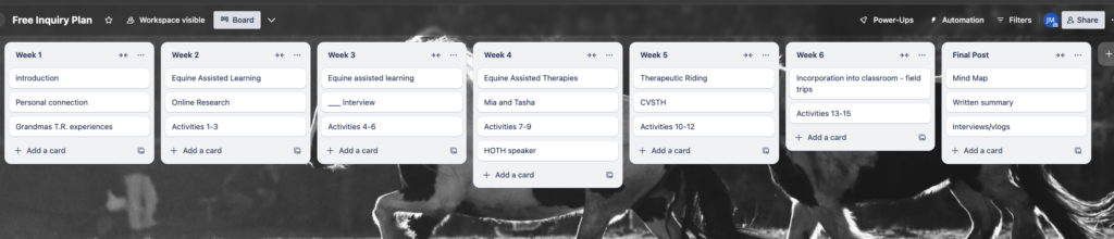 For my free inquiry project, I chose to explore a topic that I hold close to my heart, but am eager to learn more about, the great positive effects horses have on students – specifically the effects of equine assisted learning, equine assisted therapies, and therapeutic riding. Below is a rough plan of the topics I will cover throughout my inquiry project.