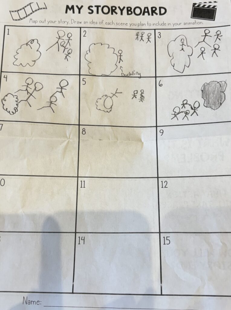We (Eva and I) started our time in the classroom getting to know our small group of students, and brainstorming ideas to make our stop motion video. The subject of our videos were students ‘desk pets’. Once we had an idea, we then worked together as a group on our stop motion video planning page, and story board.