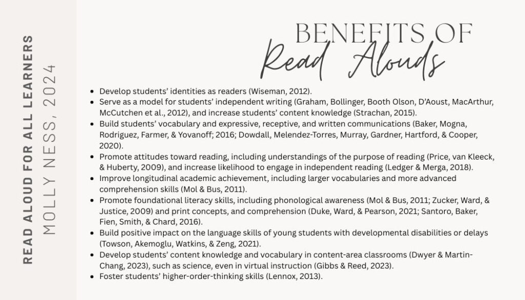 Read alouds are incredibly important for all ages, both inside and outside of the classroom! As Molly Ness stated on page one of Read Alouds for All Learners (2024), “the read aloud is necessary for every student, every day – regardless of age, grade level, or language background”.