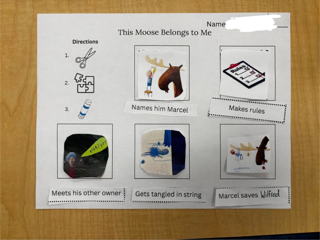 Over the past three weeks we had an amazing opportunity to do a read-aloud with various classes at Gordon Terrace Elementary. This was a great opportunity for us, and I learned a lot! I did three different read alouds with different picture books. I chose my favourite book and activity to share in this blog post. Below is the completed Read Aloud Planning Template from Read Alouds for All Learners by Molly Ness (2024). This read aloud is based on the book ‘This Moose Belongs to Me’ by Oliver Jeffers.
