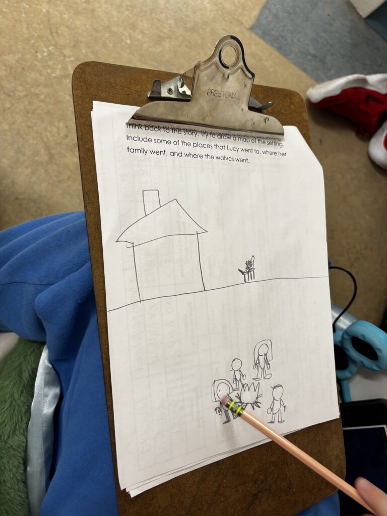 We started by doing station reading, where we had five different readers all assigned to a different part of the story, and small groups of students would move from station to station. Because of this staggered start, students who were waiting to start listening to the book had the opportunity to work on the vocabulary parts of their âThe Wolves in the Wallsâ booklet.